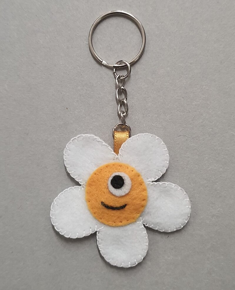 Portachiavi in pannolenci nero con imbottitura in ovatta cm 6 x 6 circa. Con catenella e anello diametro cm 2,5. Lunghezza complessiva cm 11.