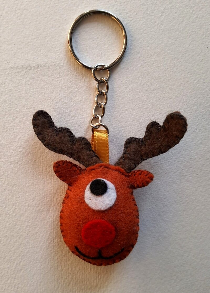 Portachiavi in pannolenci  con imbottitura in ovatta cm 6 x 7 circa, con catenella e anello di cm 2,5. lunhezza complessiva cm 11,5.